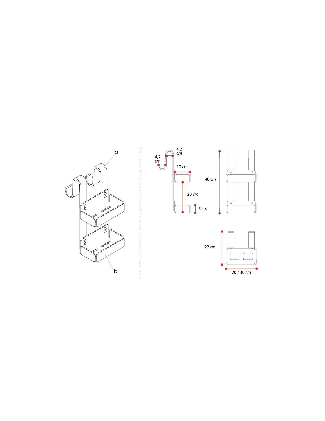 Questa mensola è dotata di due contenitori (larghezza 20 oppure 30 cm) e di due ganci esterni utilissimi per appendere gli asciugamani.