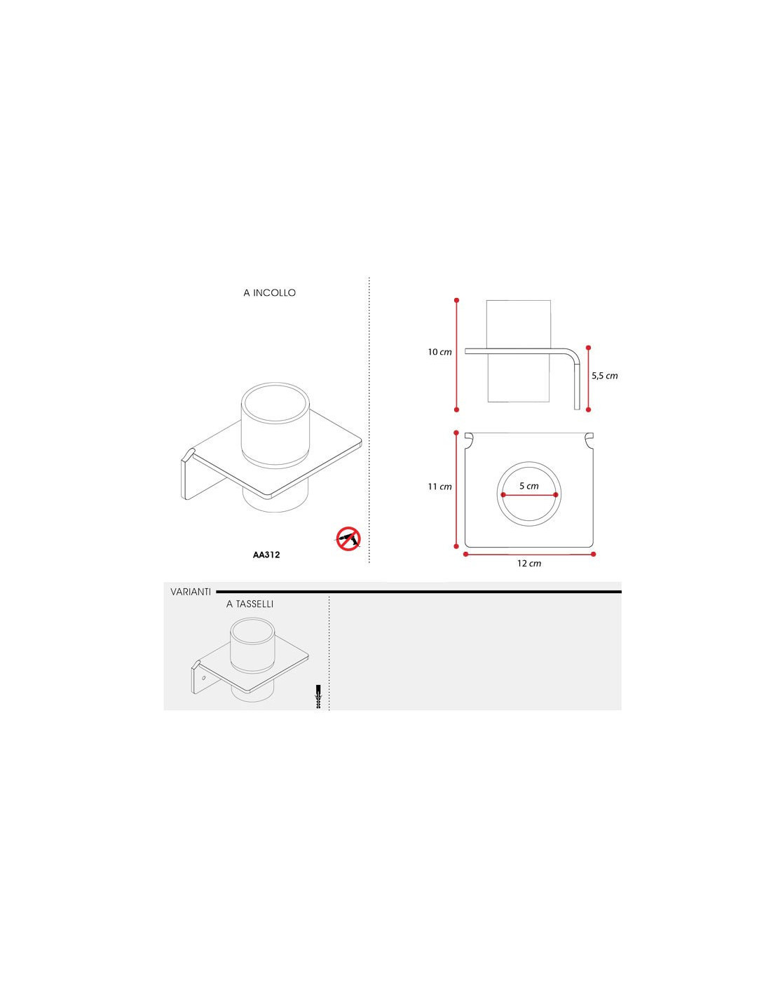 Composto da due pezzi, questo comodo porta spazzolino potrà essere acquistato sia con la base da fissare al muro con i tasselli oppure semplicemente da incollare alle piastrelle, inclusi nella confezione.