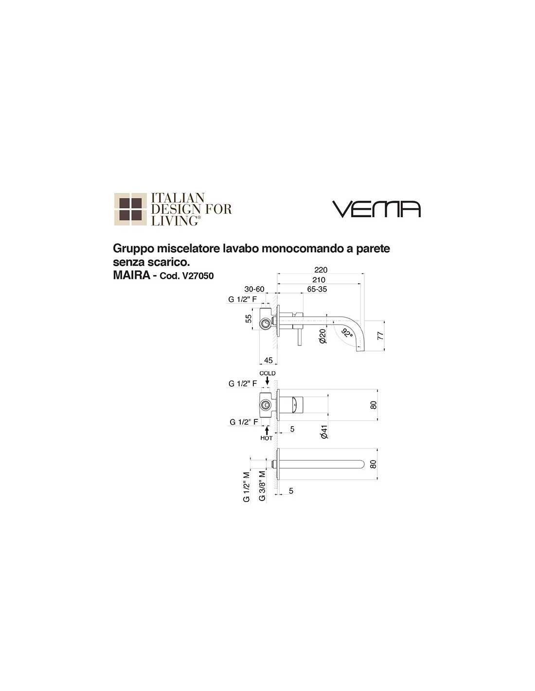 Questo miscelatore è adatto ai lavabi da parete con bocca L= 220 e raccorderia di collegamento, viene fornito senza scarico