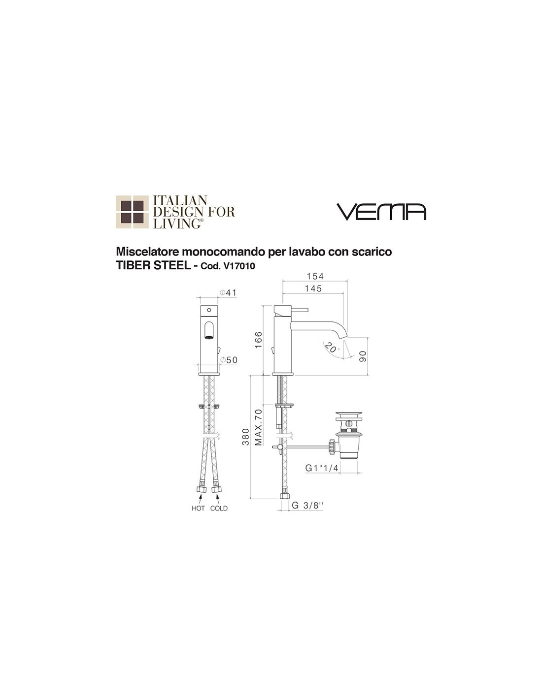 Miscelatore monocomando per lavabo con scarico TIBER STEEL.