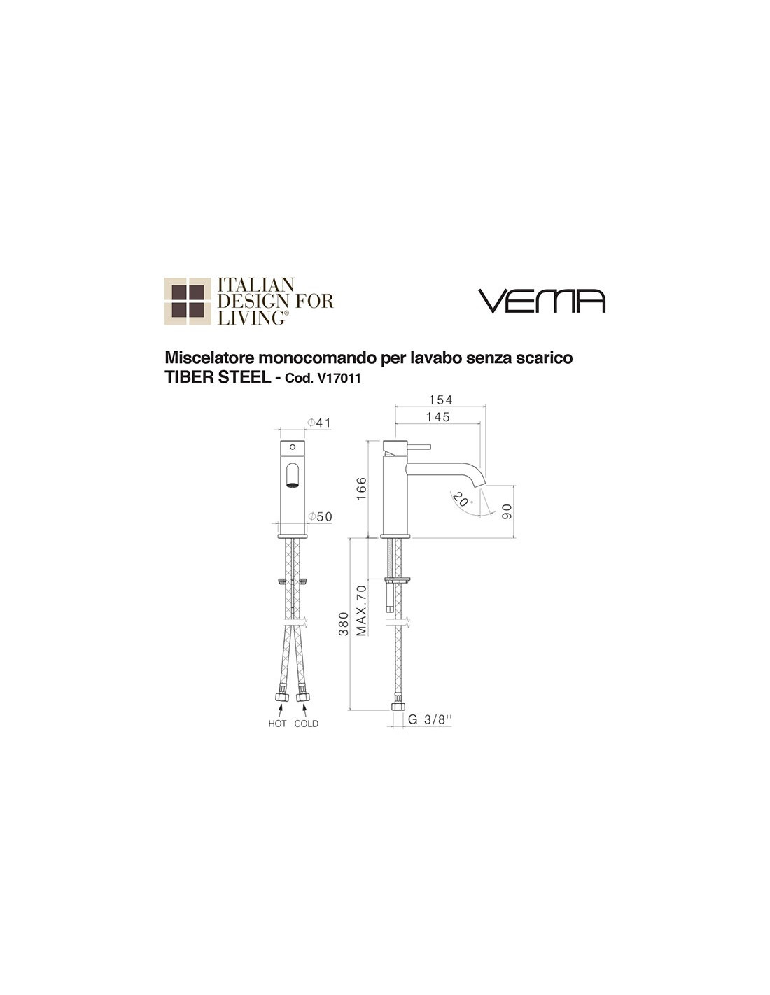 Miscelatore monocomando per lavabo senza scarico TIBER STEEL.